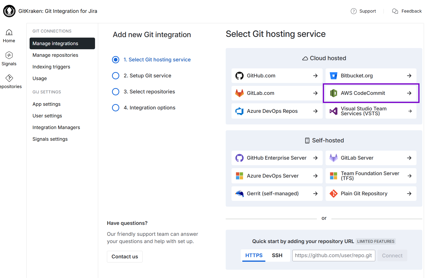 We recommend using the Full feature integrations panel (formerly Auto-connect integration panel) to connect multiple repositories from your AWS CodeCommit git host.