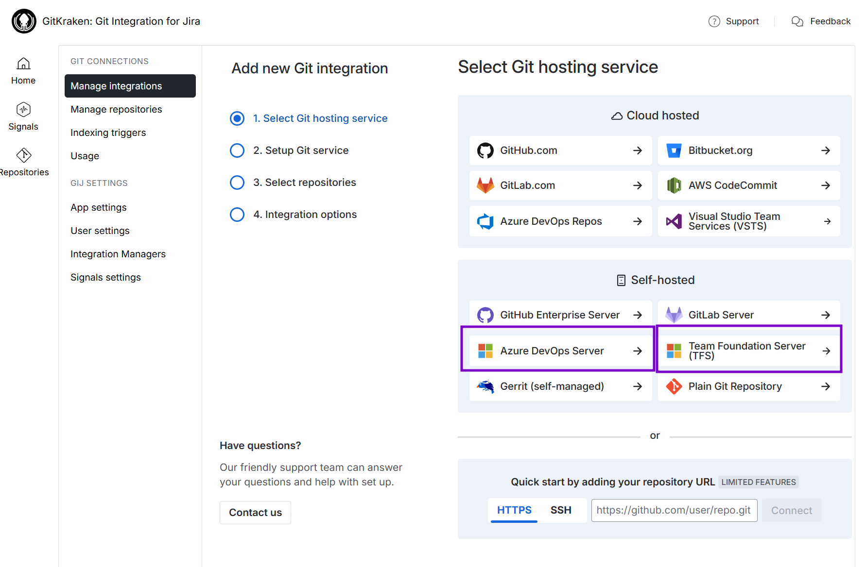 We recommend using the Git service integrations panel to connect multiple repositories from your Azure DevOps Server/TFS account.