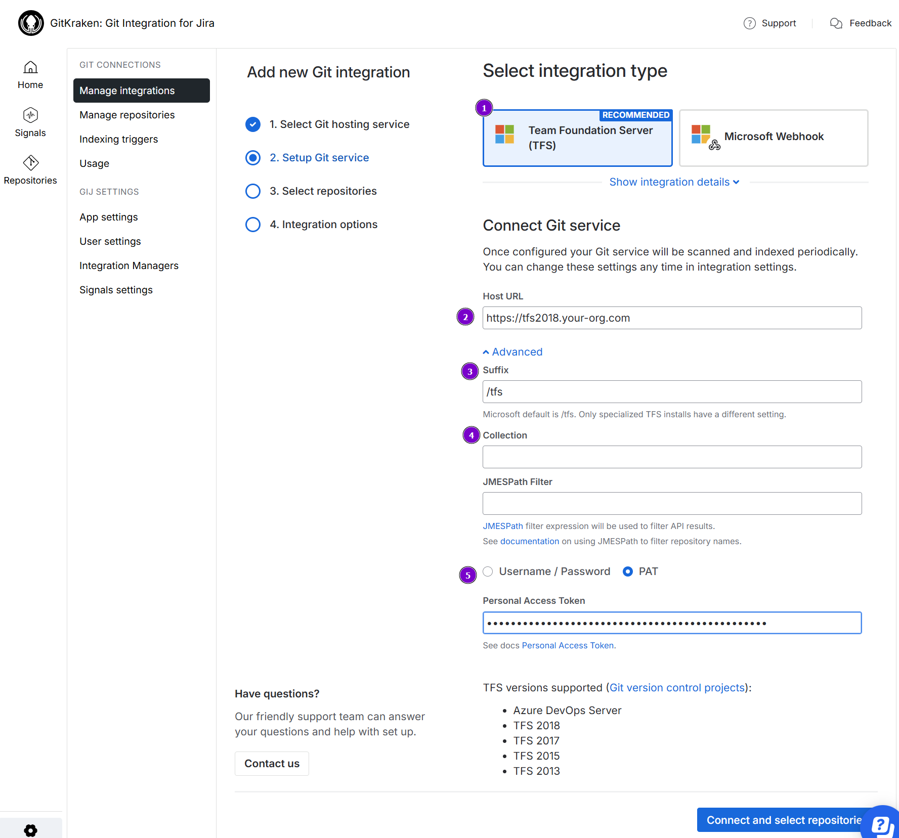 1. Choose **Team Foundation Server** for the integration type (recommended). If you are using **Azure DevOps Server**, choose that instead. 2. Enter the **Host URL** for your Azure DevOps/TFS git server. 3. **Suffix** – This is a relative path that defaults to `"/tfs"`. * For TFS integrations, the suffix will have a **/tfs** as default path. Thus, there is no need to add the `/tfs` to the **Host URL** path. If this field is blank, the Git Integration for Jira app automatically appends the default `"/tfs"` suffix and scans for all the collections inside it. * If this field is not empty, the app assumes it as a single collection path and will try to use it. * <b style='background-color:#DEEAFE; padding:1px 5px; color:#0C42A3; border-radius:3px; margin: 0 5px; font-size: small;'>AZURE DEVOPS SERVER</b> For Azure DevOps Server integrations, leave this field empty. 4. **Collection** – Enter a specific collection to use. If you know your specific collection, type its name in the provided box. The Git Integration app defaults to read and import all collection from the connected Azure DevOps Server/TFS server. 5. <b style='background-color:#FFF1B6; padding:1px 5px; color:#172A4C; border-radius:3px; margin: 0 5px; font-size: small;'>IMPORTANT</b> For TFS 2017 and newer, use <b>PAT</b> for authentication. Otherwise, use <b>Username/Password</b> for authentication (for example: TFS 2013/2015). PATs were introduced with TFS 2017 and newer. TFS 2013 and TFS 2015 do not support PATs. ```java IMPORTANT! ========== Do NOT include the <DOMAIN> in the Username field when Azure DevOps Server/TFS is connected to Active Directory. Example: "BigBrassBand\johnsmith" ==> "johnsmith" ```- Make sure to configure your PAT according to these articles: Team Foundation Server or Azure DevOps Server — especially the setting for Organization which must be set to All accessible organizations.