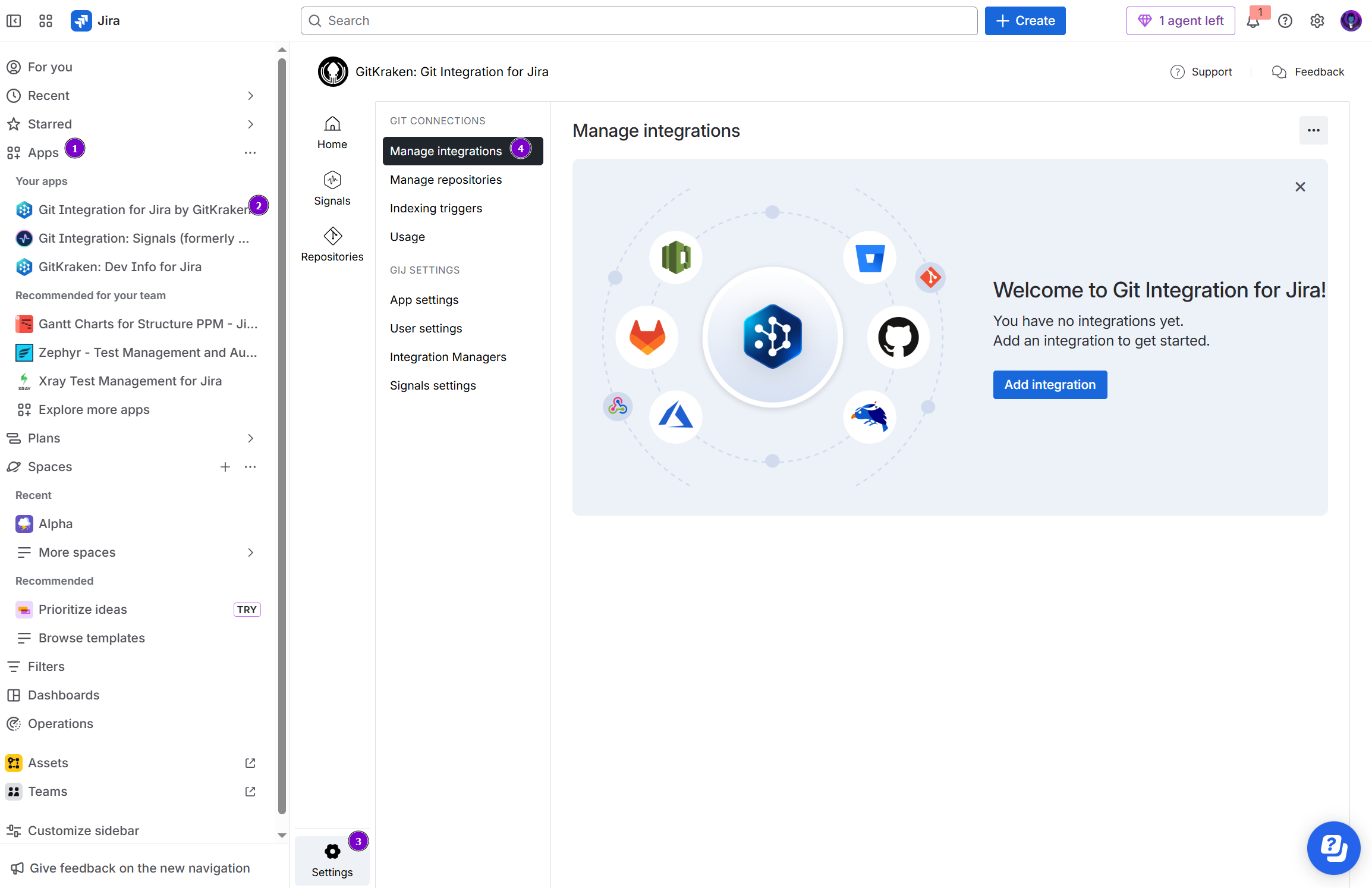On your Jira side bar, go to Apps ➜ Git Integration for Jira, then Settings ➜ Manage Integrations
