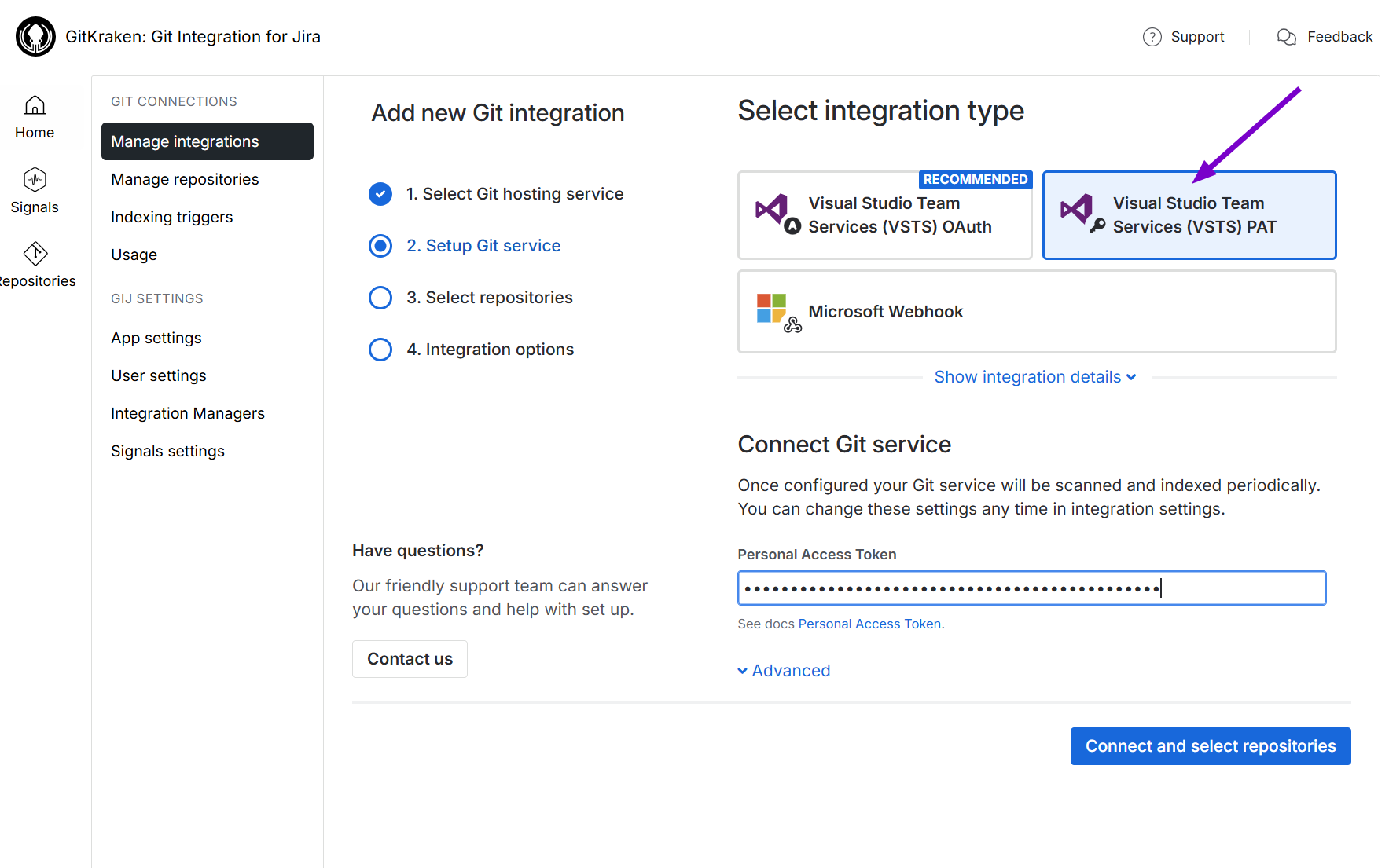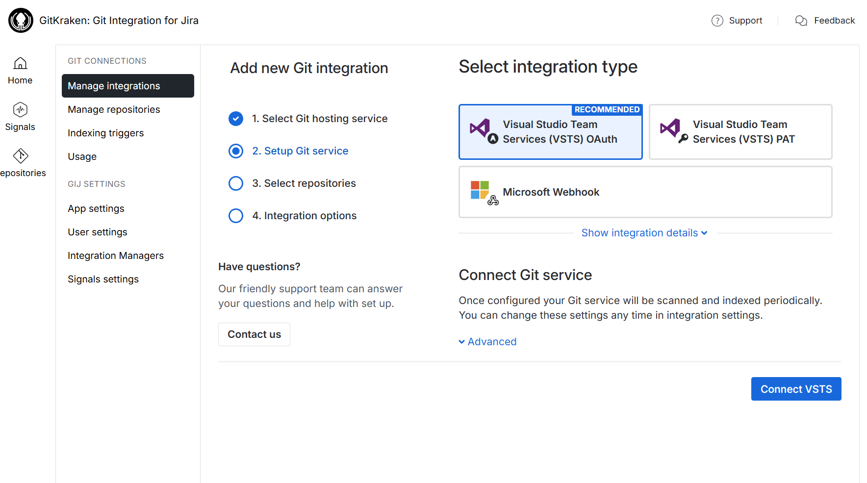 We recommend the PAT integration for this git service. This uses personal access tokens to setup Azure/VSTS integrations. Users will have to configure their own PAT from Azure/VSTS to use for this setup.