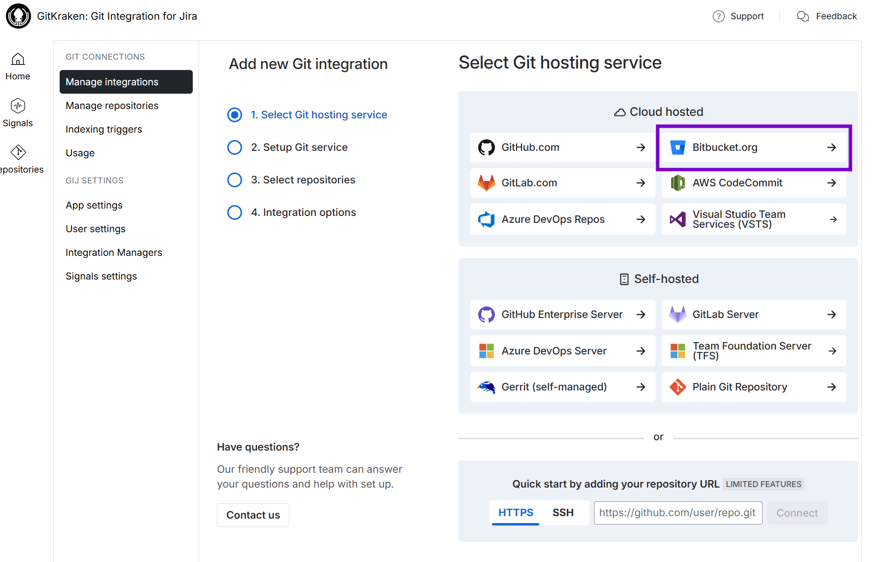 For the following screen, click Bitbucket.org to start integration with this git service.