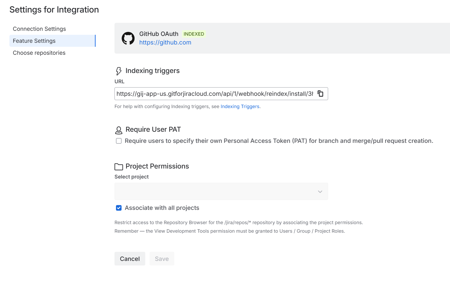 | Indexing triggers | This is the automatically-generated webhook URL upon installation of Git Integration for Jira Cloud.