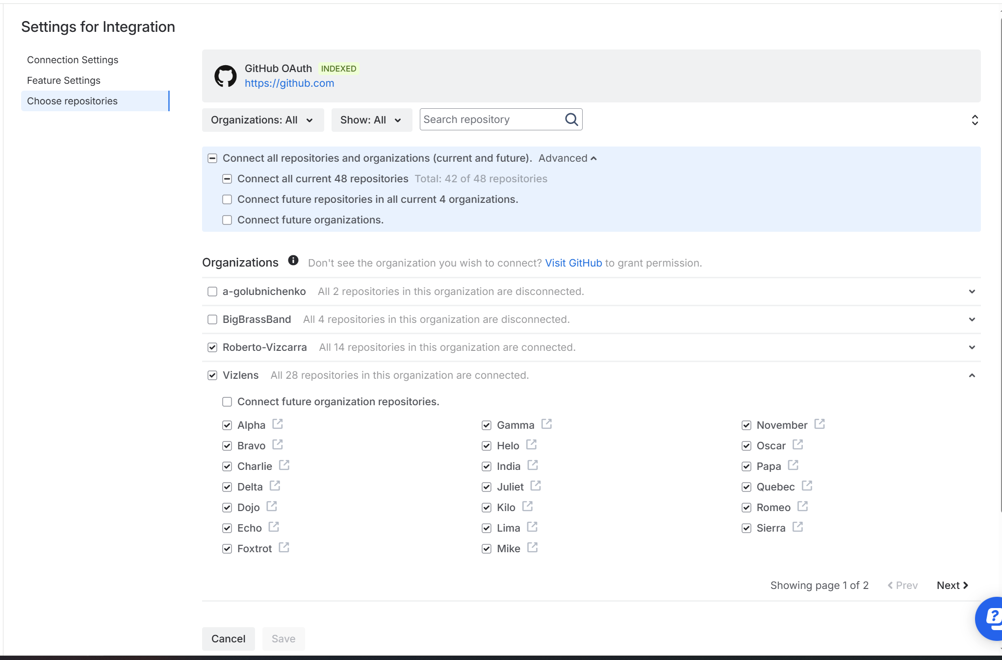 The connection settings page contains configuration options to manage integration connection and displayed repositories.