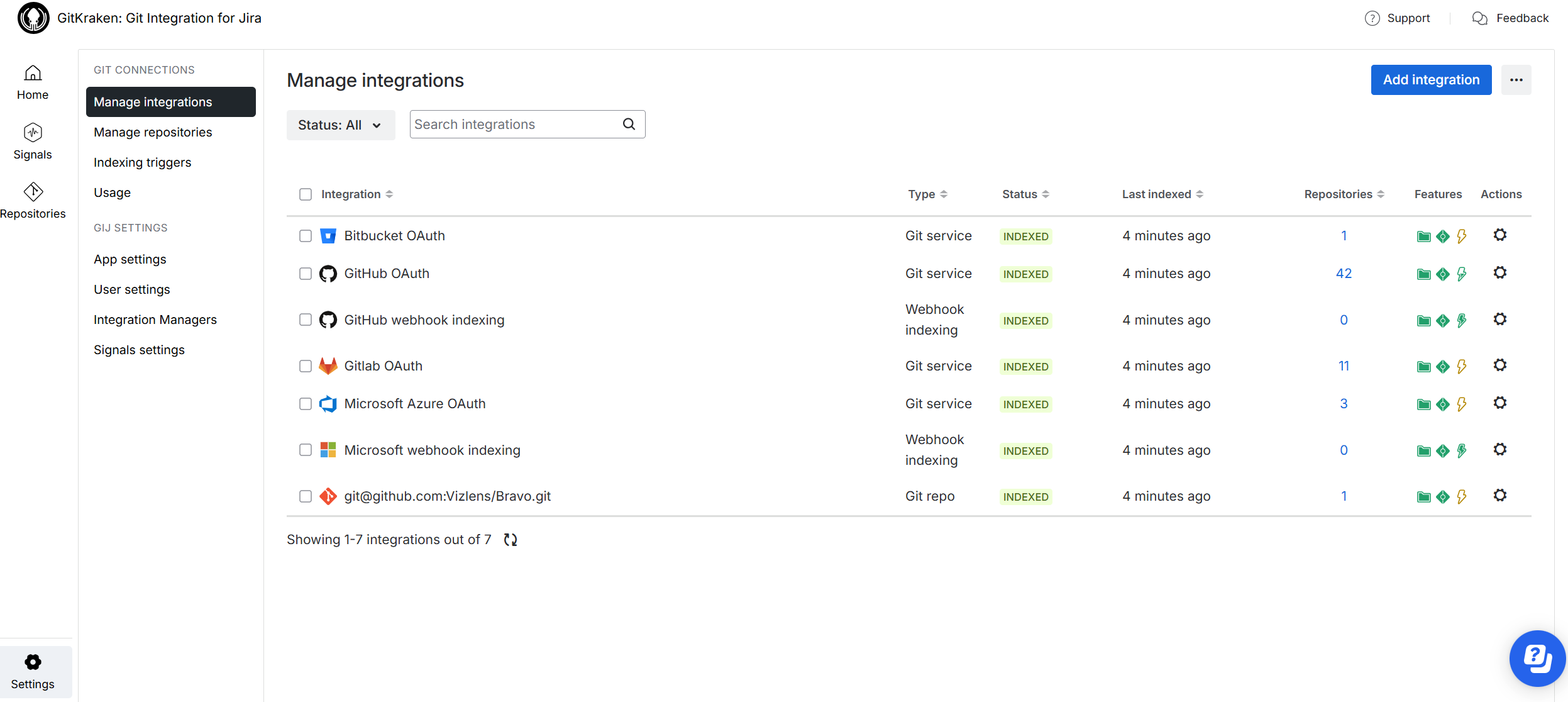 The Manage integrations page allows administrators to integrate and manage supported git host services in Jira.