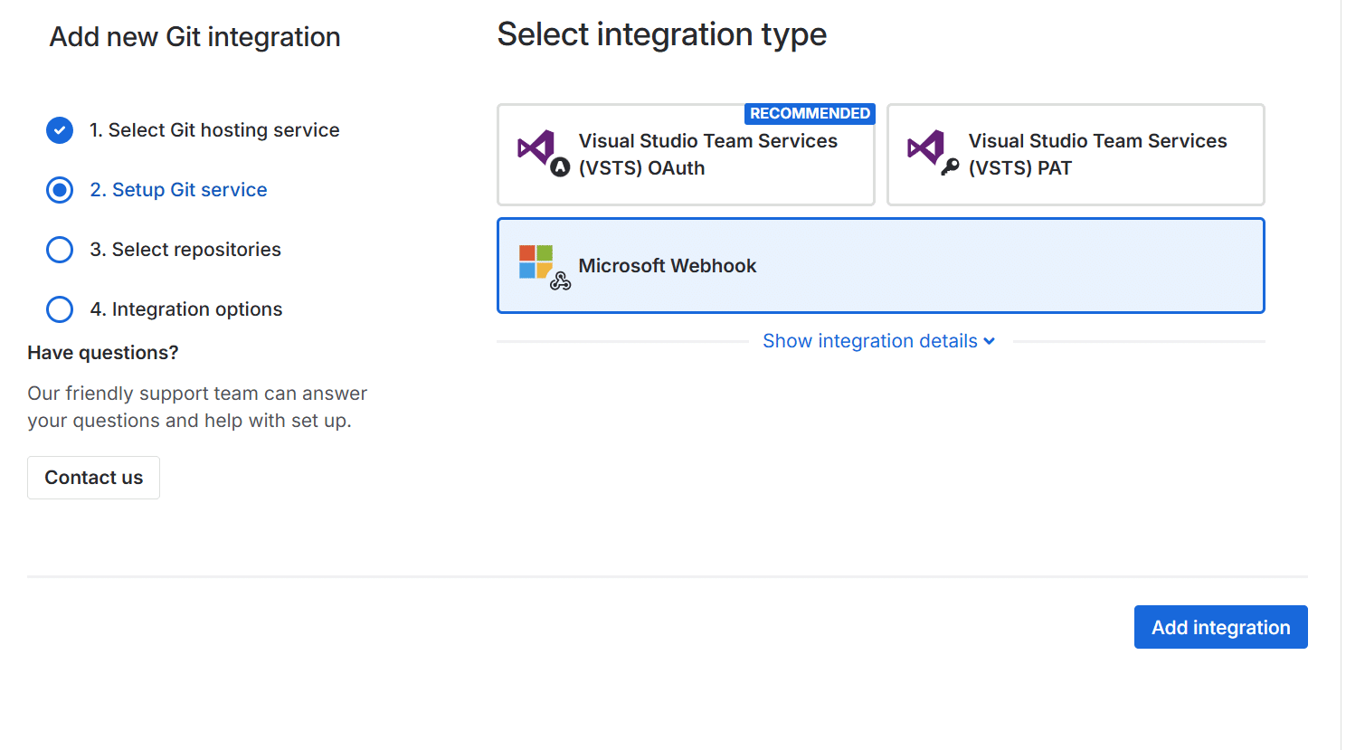 On the following screen, click on the Git service integration panel for your integration type.