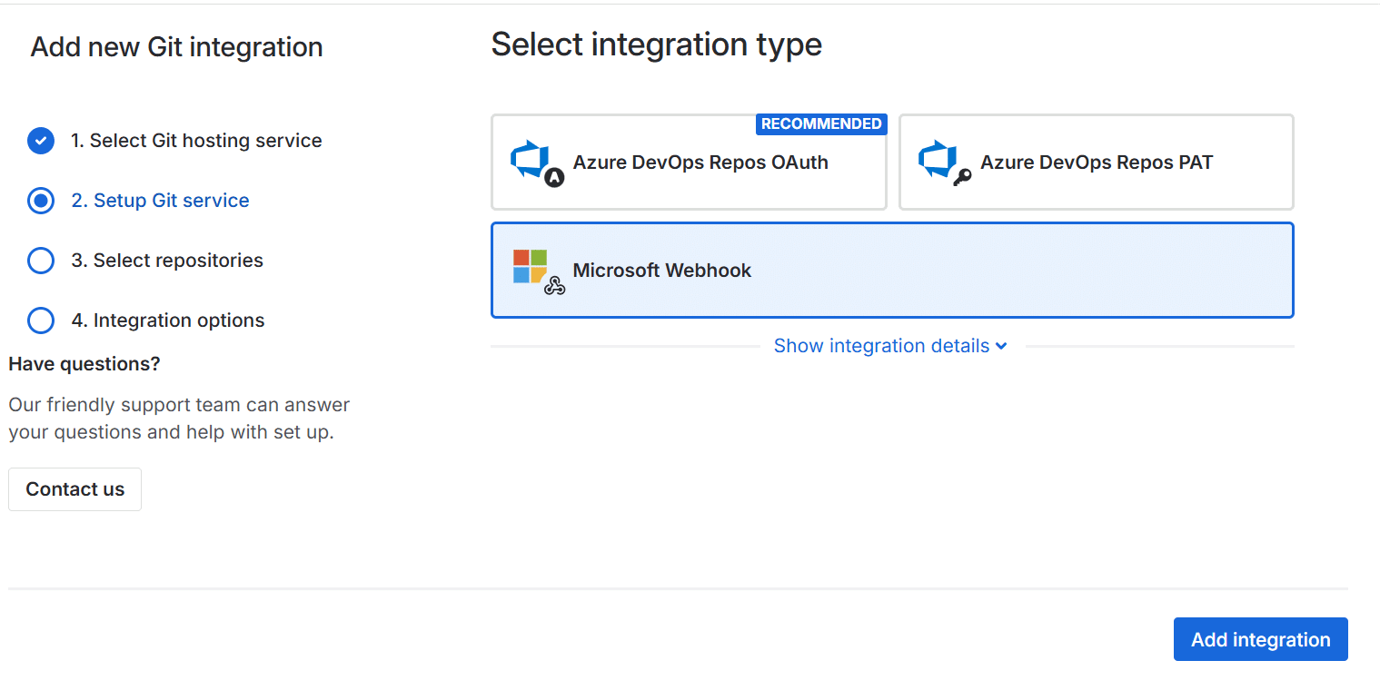 Git service integration – supports automatic connection and configuration of integration repositories using your Git service account or PAT.