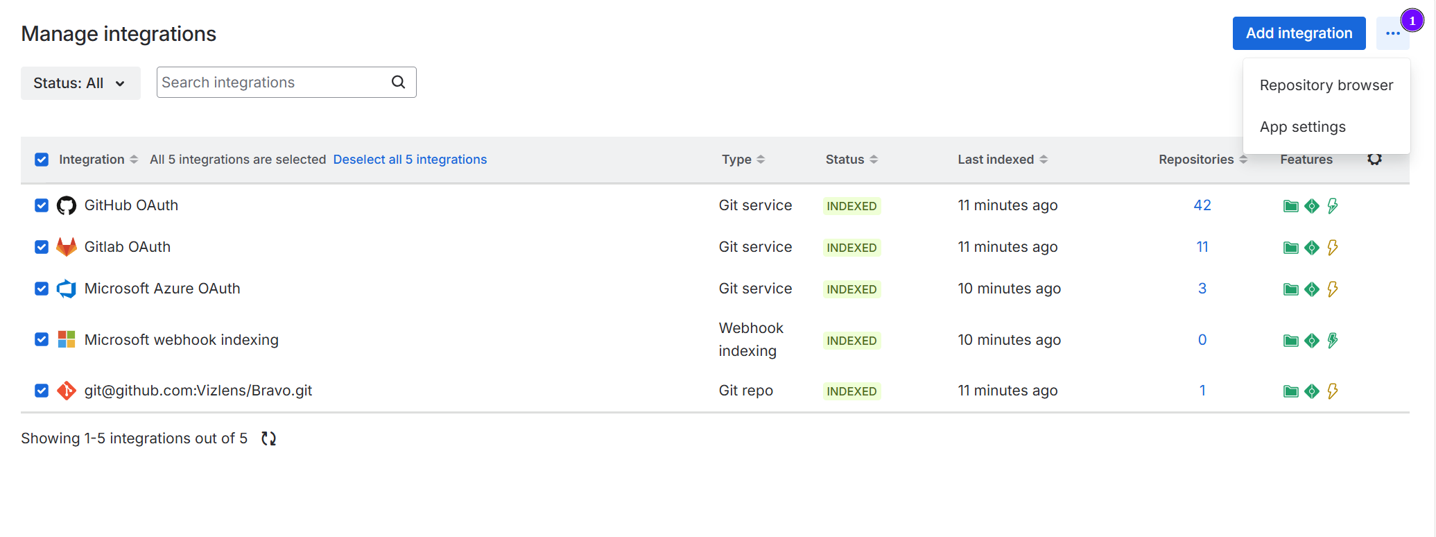 Use the checkbox to select specific integrations/repositories from the list. Pair this with actions to perform multiple configuration for selected items.