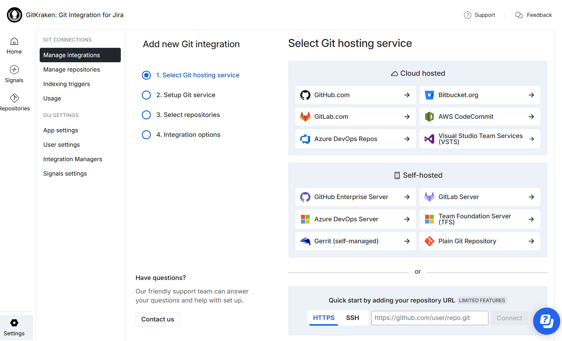 Plain Git integration – manually connect single HTTP/HTTPS or SSH git repositories into Jira. See supported Remote Git URL examples in the connection wizard.