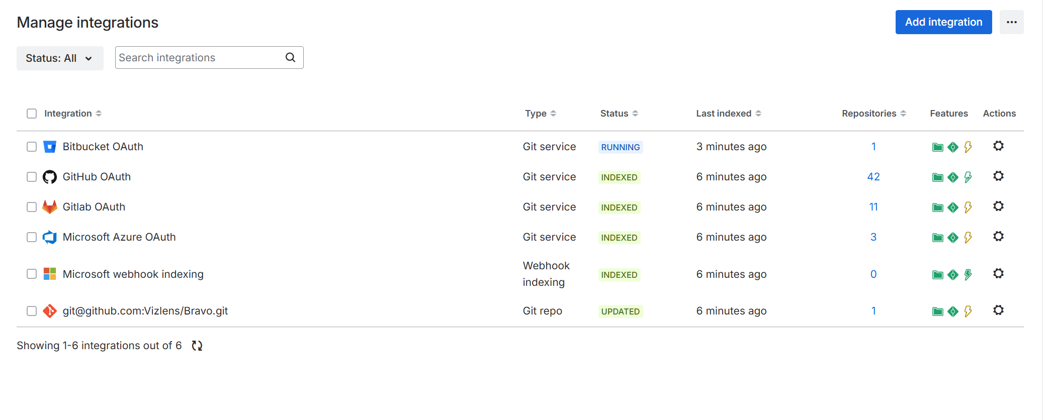 On the Manage integrations page, click Add integration to start connecting git repositories from your git host service.