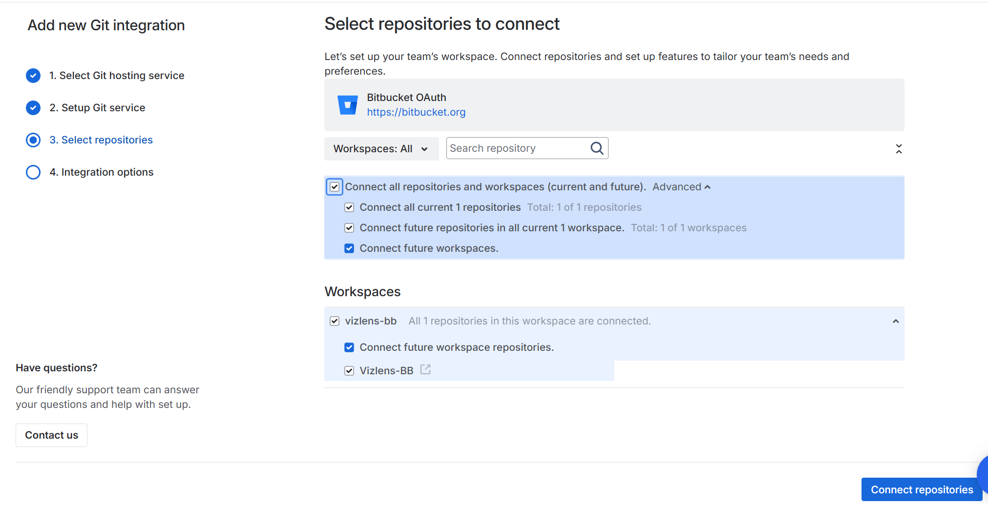 After the scan completes, select one or more repositories to connect to Jira, then click Connect repositories.