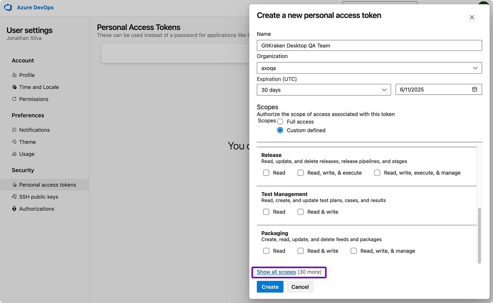 - Log in to Azure DevOps and generate a token.