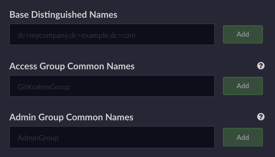 - Access Group Common Names – Groups that are granted GitKraken licenses. If omitted, all found users are granted access.