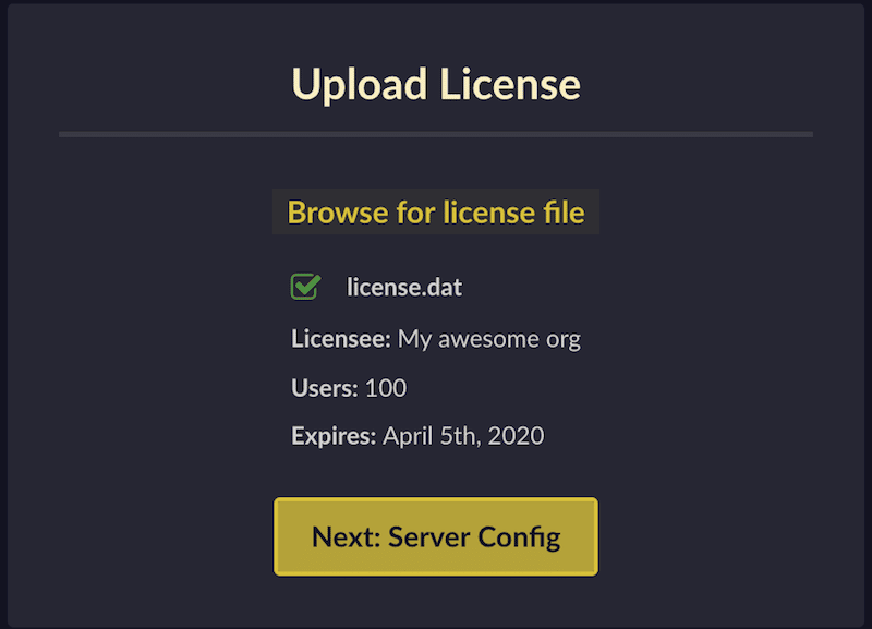 - Click Browse for license and upload the license file included with your installation package.