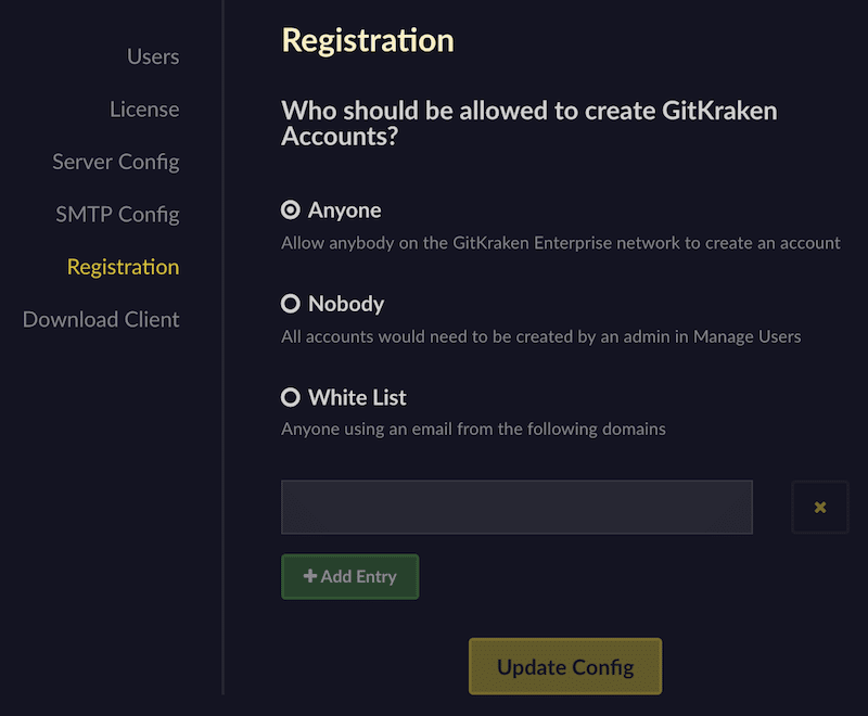 By default, users can self-register on the GitKraken Self-Hosted site. To disable self-registration, go to the Registration tab: