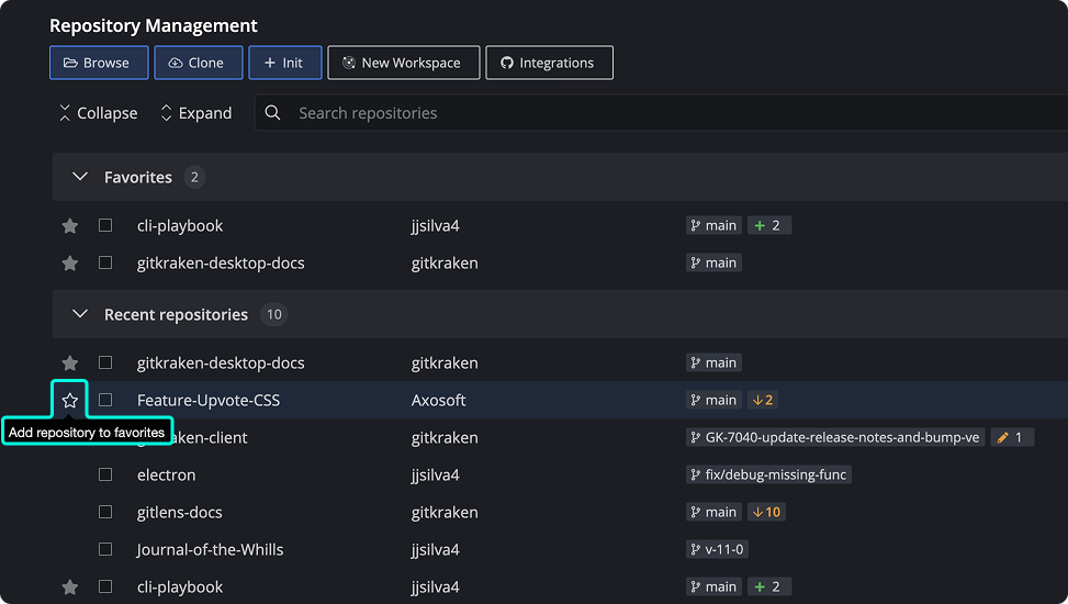 Favoriting repositories allows you to quickly access commonly used projects in GitKraken Desktop from the Repo Management tab, dropdown menus, or keyboard shortcuts.