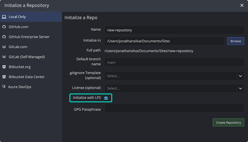 You can initialize Git LFS during repository creation by selecting Initialize with LFS.