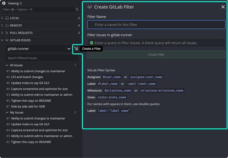 Use GitLab’s issue syntax to create filters and narrow your view.