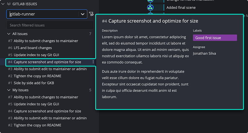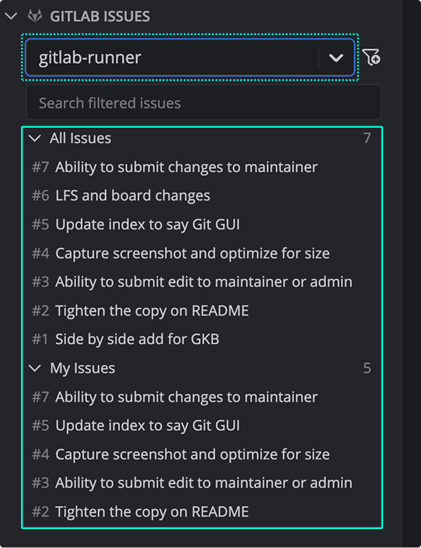 After connecting, your GitLab issues will appear in the Left Panel. Default filters include My Issues and All Issues.