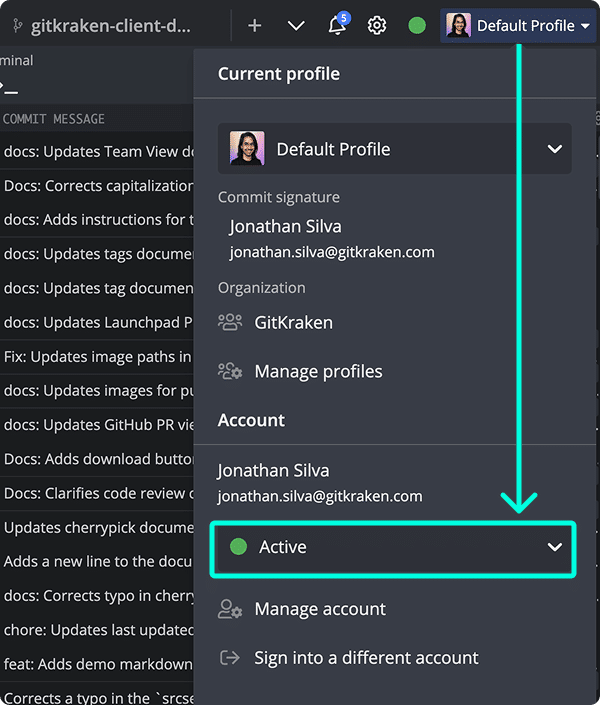 The status icon appears on team member avatars to show who is currently active in GitKraken Desktop. This indicator is visible in both the Team View and the Organization section of Preferences.