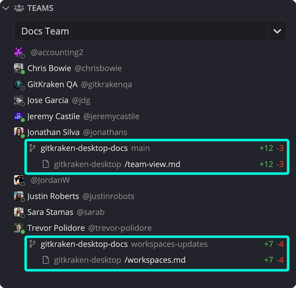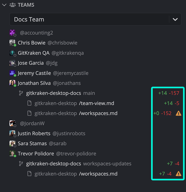 The Team View allows you to see what branches and files members of your organization are currently working on. This is helpful for avoiding and collaborating on merge conflicts.