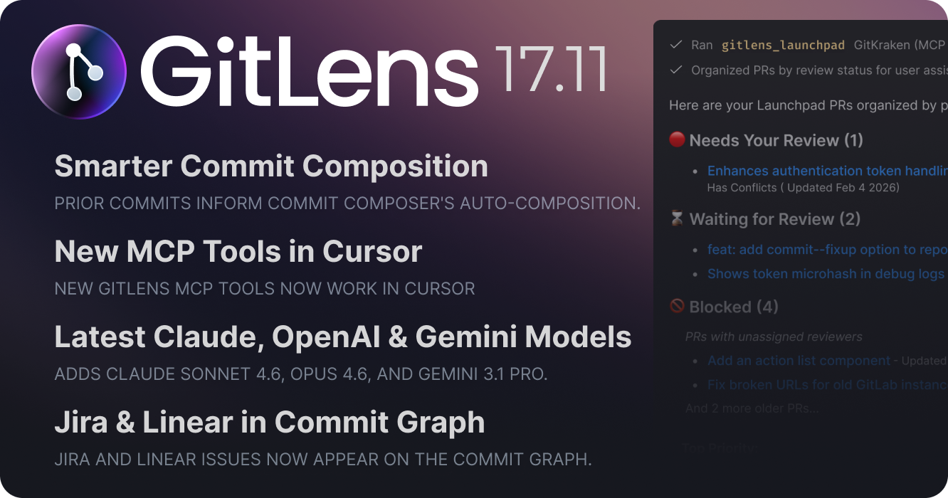 GitLens 17.11 brings smarter Commit Composer composition that uses your existing commits as context, expands MCP tool support to Cursor and other VS Code-based IDEs, and adds the latest Claude and Gemini AI models. This release also delivers a focused set of bug fixes for Jira and Linear integration, GitLab workflows, and stash operations.